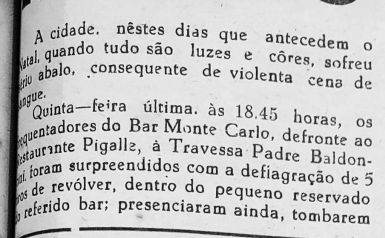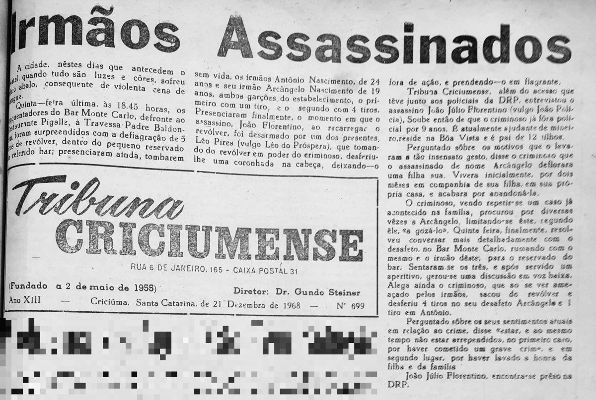Fim de tarde, 19 de dezembro de 1968. Enquanto o país ainda digeria o AI-5, a população do Centro de Criciúma era impactada por um duplo homicídio. Às 18:45, os manos Antônio Nascimento, 24 anos, e Arcângelo, 19, sucumbiram a cinco balaços na Lanchonete Monte Carlo.
