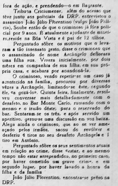 Antônio, um tiro, Arcângelo, quatro. Ambos conheciam J.J.F., um ex-PM conhecido por João Polícia. O mais novo não só conhecia como usufruíra por dois meses da sua residência e da cama de uma das suas filhas. O fim do relacionamento conjugal, o pivô do crime.